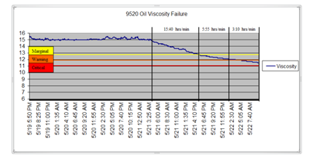 隨著原油粘度下降從正常到邊緣(約13 cP)在一段15小時40分鐘,工程師希望他能夠到達下維修設施。在接下來的8個小時,粘度中掉落的警告狀況(12 cP),對關鍵(11 cP)。它到達及時維修設施。調(diào)換火車頭,火車可能繼續(xù)其計劃。驗證了引擎故障,并進行了改革,具有顯著的節(jié)省公司。